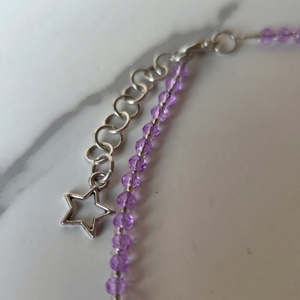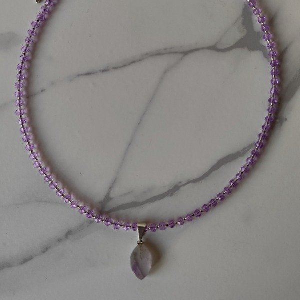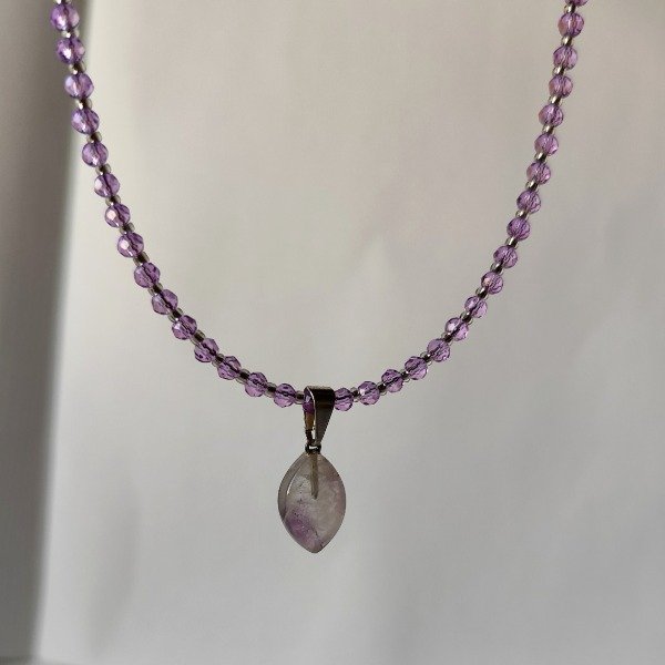 El dije principal es una hoja de Amatista, una piedra que invita a la introspección, la serenidad mental y el desarrollo intuitivo.