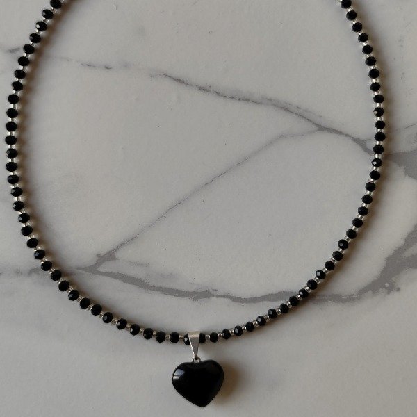 El dije principal es un corazón de Obsidiana Negra, una piedra que ayuda a enraizar, limpiar energías densas y fortalecer la claridad interna. Actúa como escudo energético.