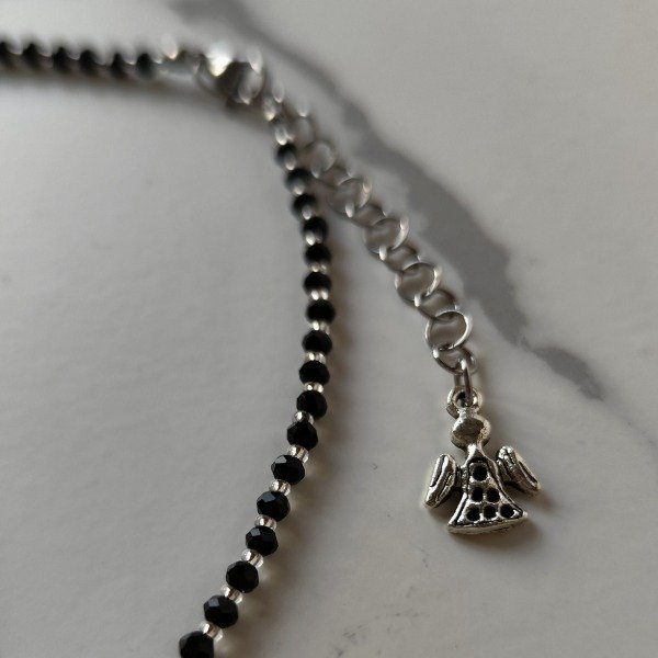 En el extremo, el pequeño dije "un ángel" —de níquel— que suma un detalle delicado en coherencia con la protección que aporta este collar.